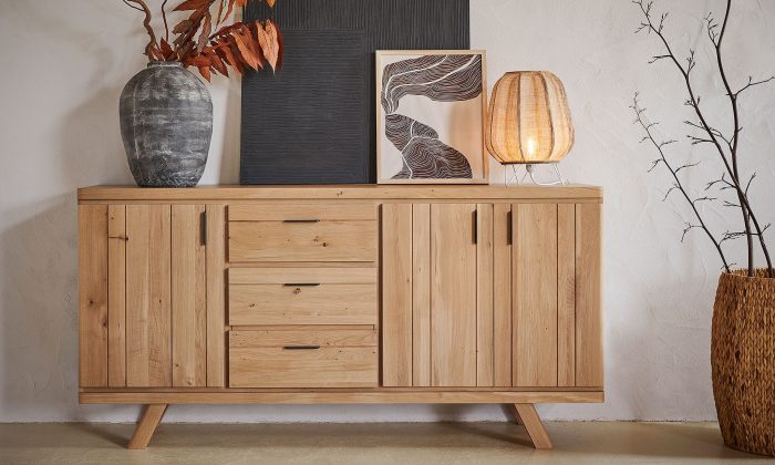 Une commode finition bois MDF laqué en sable et placage chêne.